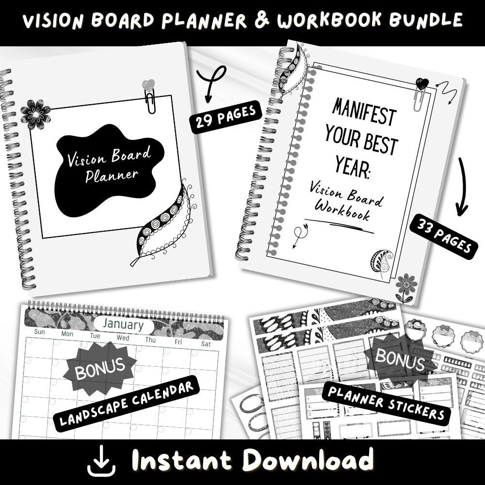 - PLR Black & White Vision Board Planner & Workbook (Plus matching planner stickers)