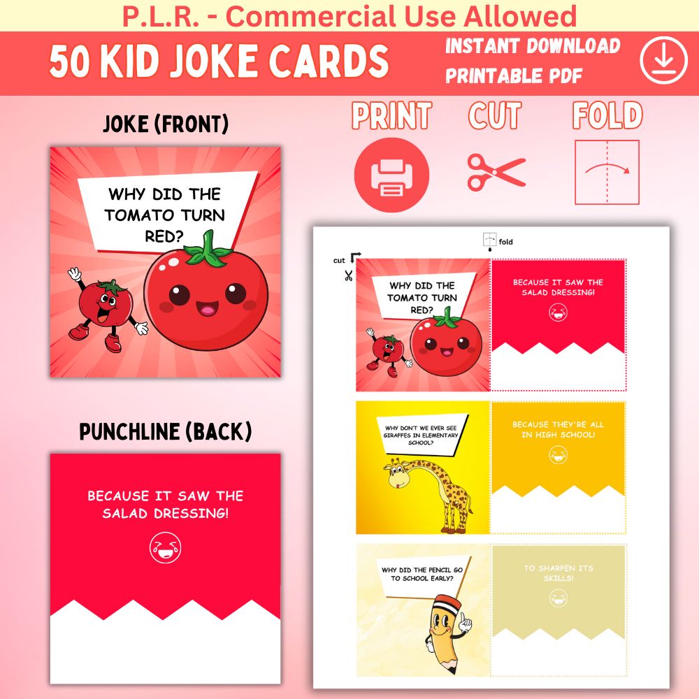 Get your kids laughing with PLR 50 Kid Joke Cards! This pack includes 50 printable cards that you can resell, plus matching promo images. Perfect for parents, teachers, or anyone who wants to spread some playful humor. Enjoy endless fun and potential profits with PLR 50 Kid Joke Cards.