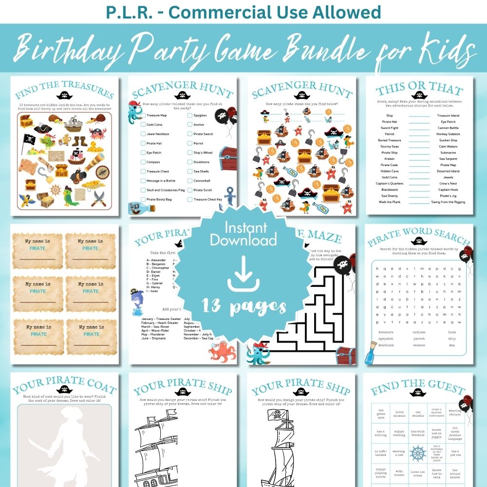 - Instant PDF Download (13 pages) of the PLR Aqua Pirate Birthday Party Game Bundle