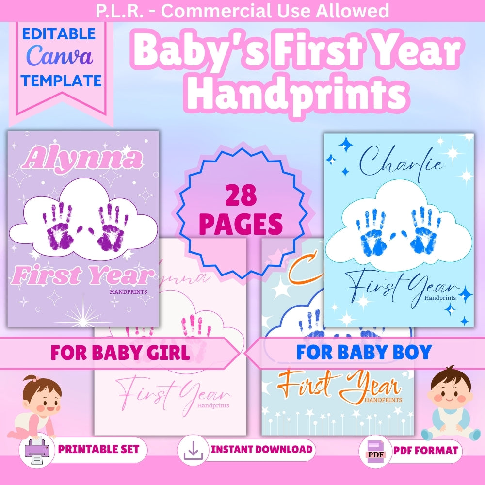 - Canva Templates (32 pages) of the PLR Baby's First Year Handprints