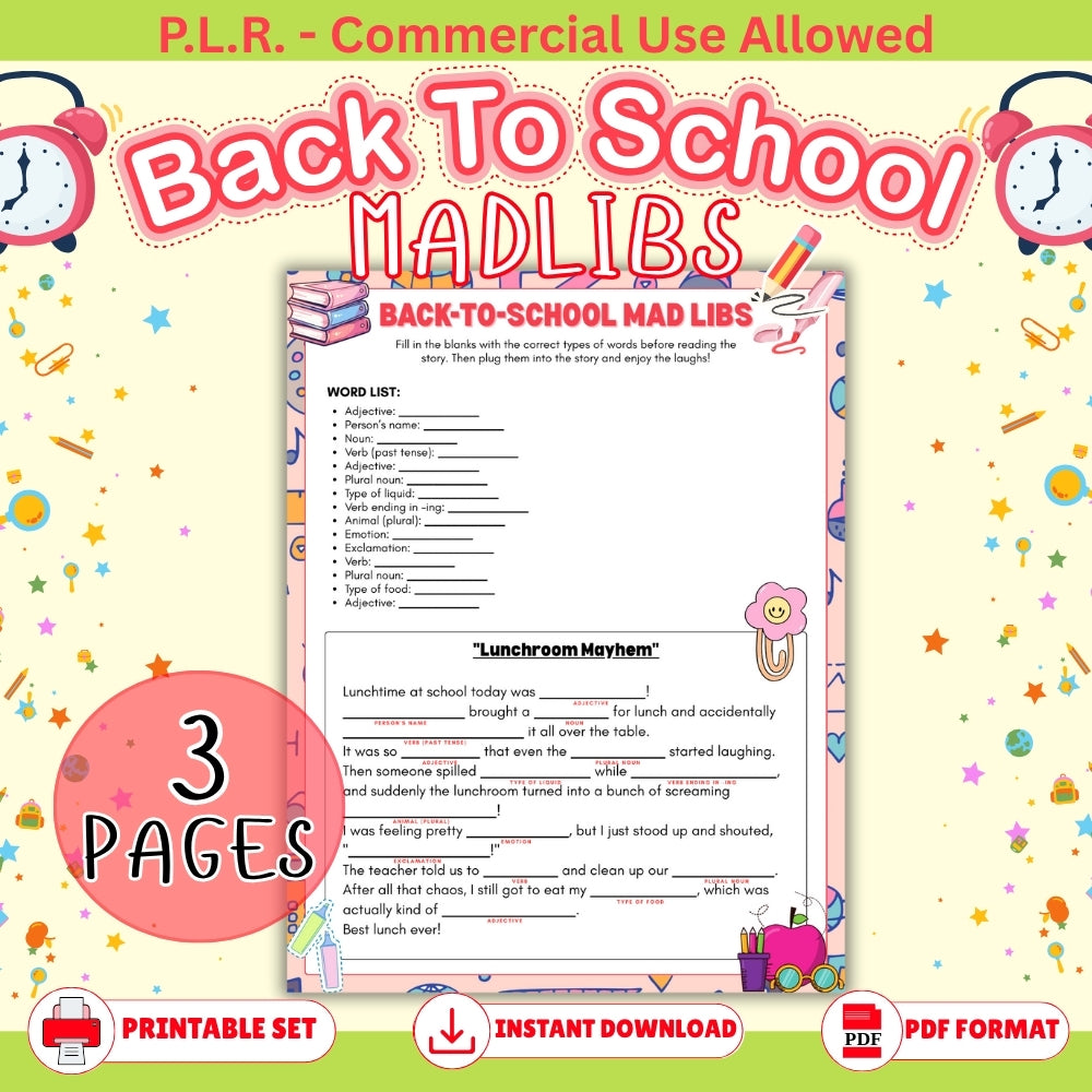 - Instant PDF Download (3 pages) of the PLR Back to School Mad Libs