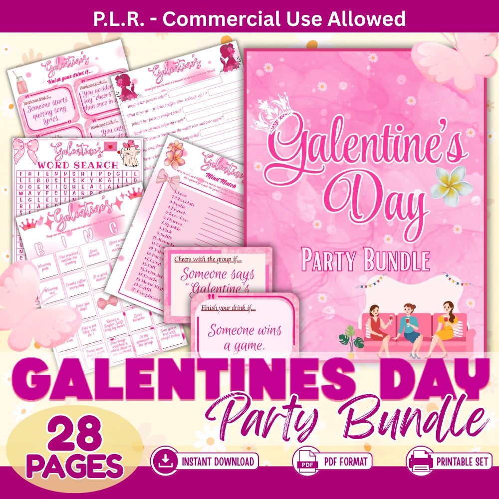 Get 28 pages of Galentine's Day party games with full PLR rights. This bundle includes ready-to-print games, activities, and entertainment ideas you can rebrand and resell immediately. Ideal for event planners, teachers, and digital entrepreneurs seeking profitable printable products. Start selling today with zero restrictions.