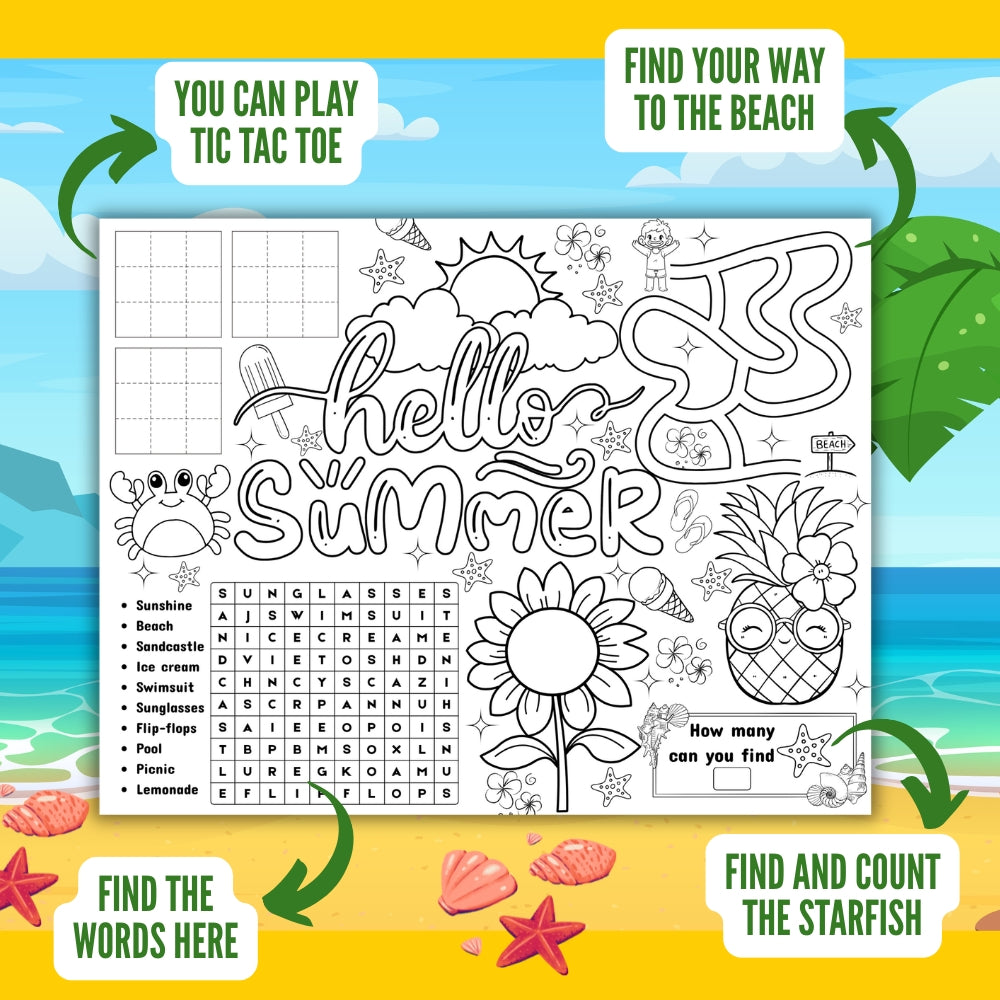 Keep kids entertained with these 5 unique, printable summer activity placemats! Perfect for sunny days, each placemat features fun games and puzzles that spark creativity and laughter. Easy to print and resell as your own, they’re a playful way to brighten mealtime and summer gatherings.