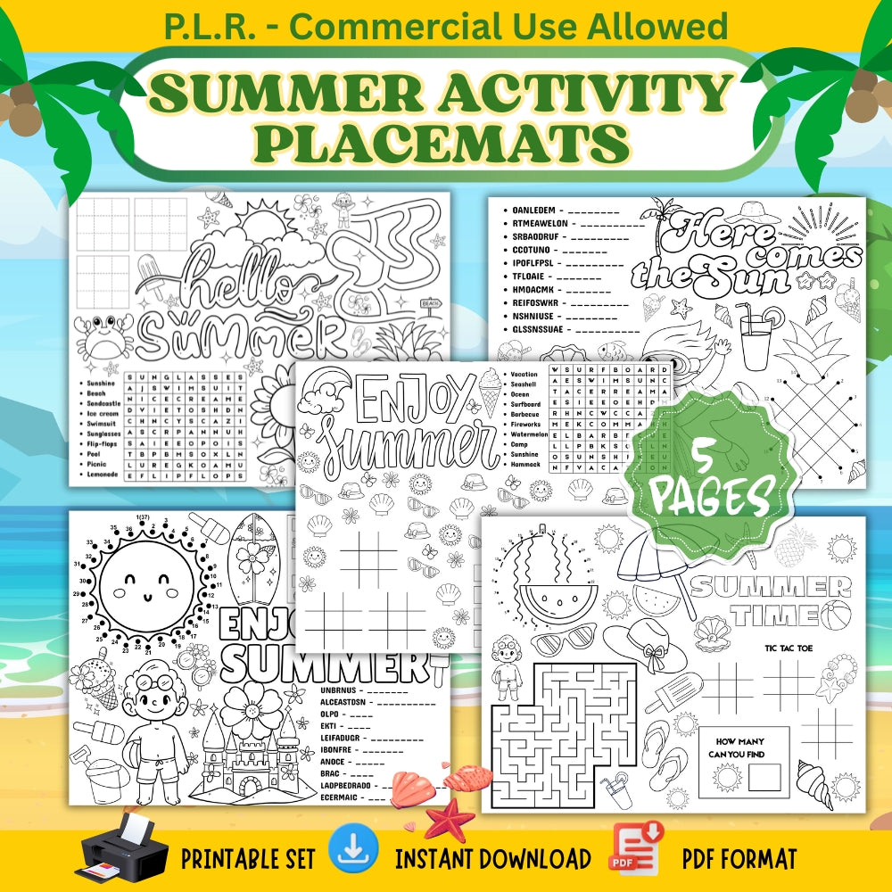 - Instant PDF Download (6 pages) of the PLR Summer Activity Placemat Pack