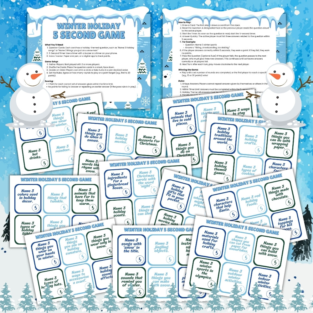 This digital product includes PDF and PNG printable files and professionally designed Canva templates for the 13 page Printable Winter 5 Second Game and the matching promotional images.