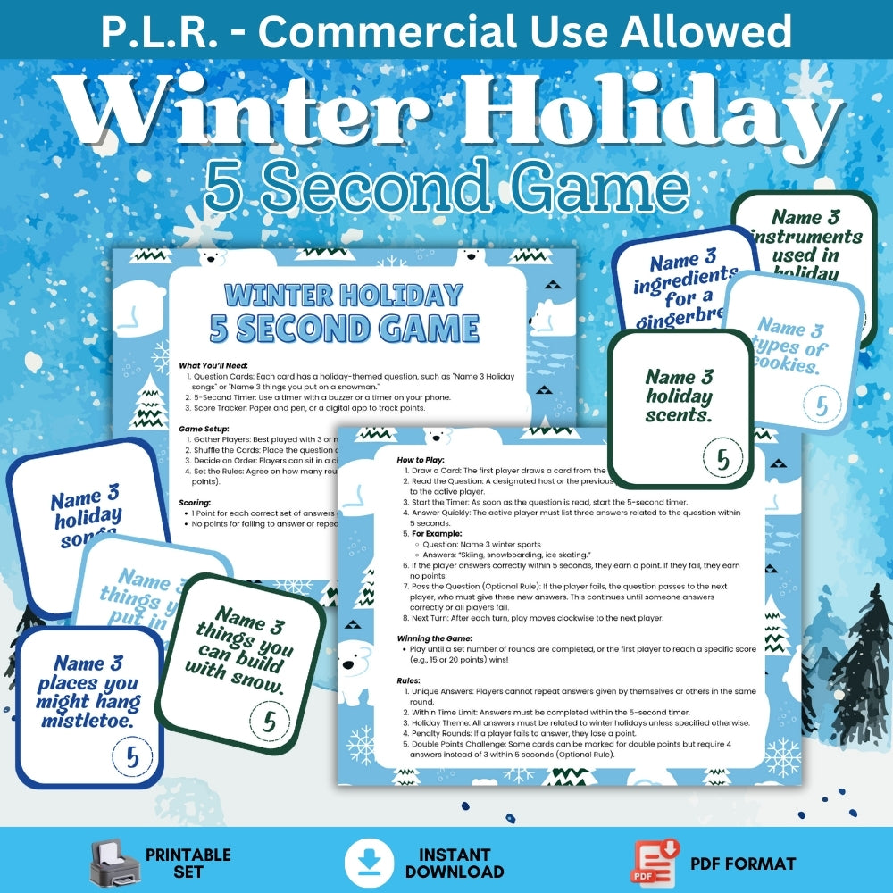 Add some fun to your winter days with PLR Winter 5 Second Game! This printable game includes 66 cards to entertain your friends and family. And the best part? You can even resell this game, doubling the laughter and fun!